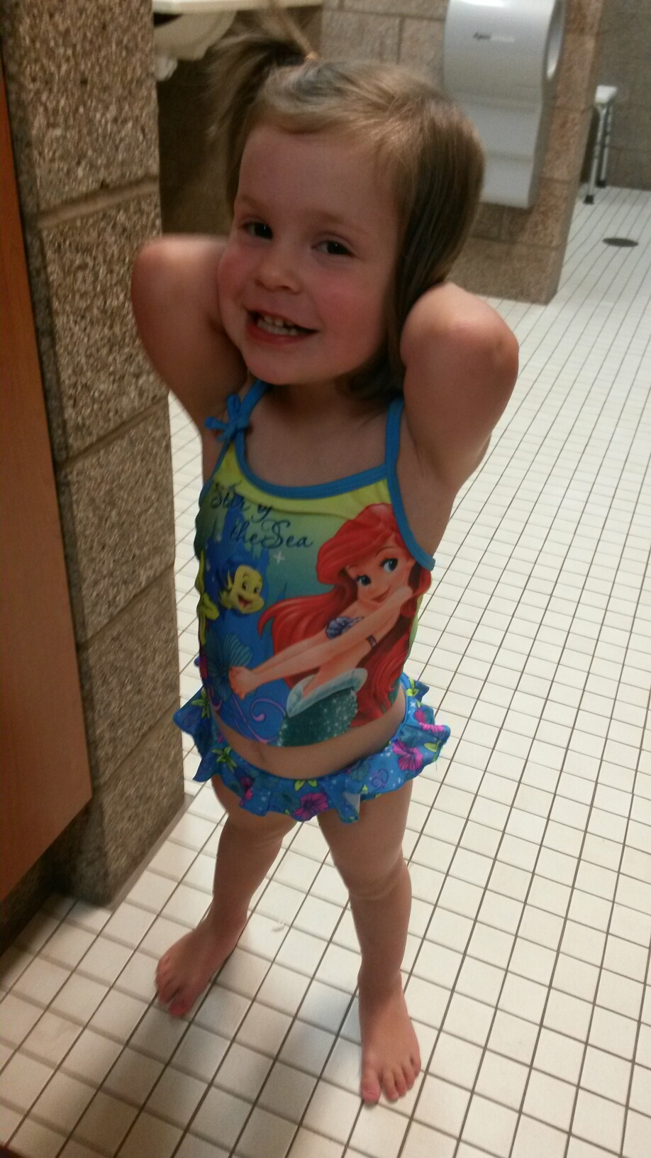 Today was one of those days were we got to tackle something we never get to do because of CF. Kyre couldn’t contain her excitement when we told her this morning she was going to go to the pool. Indoor pools are dangerous for CFers because there is a bacteria that lives in warm damp environments that is super hard to treat and it causes lung damage. So we have avoided the pool, only allowing cayden to take swim lessons from time to time. I found a swimsuit recently on the sale rack and stashed it away for our special date with Kyre. I had to pry said suit out of Kyre’s cheeto hands to pack it up, she held on to it so tight because I think she was so afraid that something she has been hungering for would be taken away.